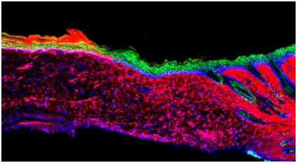 通过在实验室小鼠模型中将一种细胞类型(红色:间充质细胞)转换成另一种(绿色:基底角质形成细胞)在大面积溃疡内产生上皮细胞皮肤组织。图片来源:Salk Institute